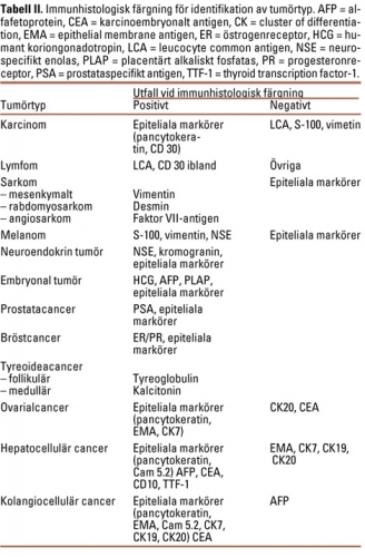 AFP, som bör tas vid lågt differentierad cancer för att upptäcka eventuell germinalcellstumör. Man kan även överväga provtagning med CA 15-3 vid misstänkt bröstcancer och CA 125 vid misstänkt ovarialcancer. Dessa analyser är dock inte specifika, och tex ses en kraftig stegring av CA 125 vid peritoneal- och pleural metastasering oavsett cancersjukdom [L-O Hansson, Uppsala, pers medd, 2004]. Tumörmarkörer kan eventuellt nyttjas i senare skede för att följa behandlingseffekt [28].