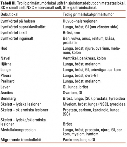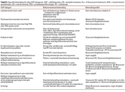 Grundprincipen är att utifrån anamnes, status, metastaslokalens läge (Tabell III) och histopatologisk undersökning av tumörvävnad rikta diagnostiska insatser för att fastställa primärtumör och behandlingsbara tillstånd [2]. Nedan ges rekommendationer avseende utredning och behandling som baseras på riktlinjer från ESMO (European Society of Medical Oncology), övrig litteratur inom området samt klinisk erfarenhet.