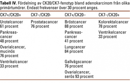 För att få vägledning om varifrån CUP utgått bör immunfärgningar utföras enligt Tabell IV. Kompletterande analys av cytokeratin 7 och 20 kan ge betydande vägledning avseende primärtumörens lokal [25]. Det finns dock ofta en överlappning, och givet den relativt låga betydelsen av att fastställa primärtumören är den kliniska nyttan inte övertygande visad.