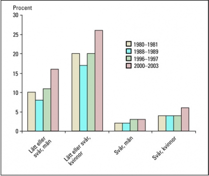 Psykisk ohälsa generellt är ett växande problem, något som bla kan avläsas av Statistiska centralbyråns årliga undersökning om levnadsförhållanden (Figur 2). En femårsuppföljning av individer som uppgett sig ha ångest, oro eller ängslan visade en förhöjd relativ risk för självmordsförsök och sjukhusvård med psykiatrisk diagnos.