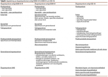 De flesta behandlingsstudier som publicerats har använt DSM-III eller DSM-III-R. Uppdelningen av ångestsyndromen enligt DSM-III-R, DSM-IV och ICD-10 framgår av Tabell I.