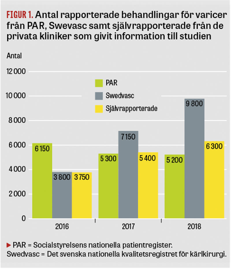 960 poster för perioden 2016–2018 uteslöts från PAR på grund av uppenbar felkodning eller brist på diagnoskod kopplad till behandlingstillfället. Behandlingstillfällen med åtgärdskod för PHT99, injektion av behandlande läkemedel i ven – där många skleroseringar av lokala varicer kodas – räknades bort då merparten hade annan diagnos än varicer (1 978 poster) för perioden. Inrapporteringsmodulen i Swedvasc är specifik för varicer, varför dessa data sågs som pålitliga. Självrapporterade volymer från privata aktörer noterades i de fall då dessa erhölls. Volymer från de olika källorna presenteras i Figur 1; dessa överlappar i okänd grad.