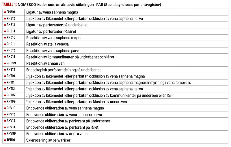 De aktuella åtgärdskoderna för vilka data som inhämtades ur PAR kan ses i Tabell 1 [10]. Dessa kombinerades med ICD-10-koder för varicer, venösa sår samt venös insufficiens för att undvika att interventioner för andra tillstånd som venösa missbildningar skulle inkluderas [11].