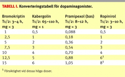 I de fall man vill byta till en icke-ergot dopaminagonist kan man använda förslaget till kompilerad konverteringstabell med dosekvivalenter, som är anpassat för de i Sverige förekommande dopaminagonisterna (Tabell I) [4, 14, 15, 18-20].