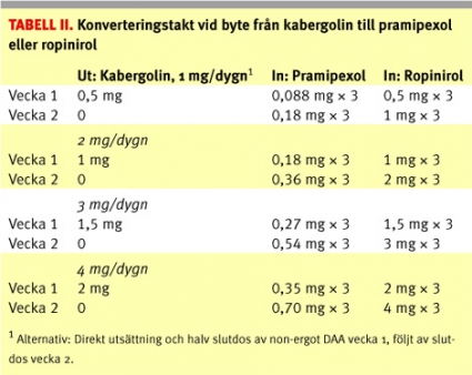 Tumregeln är att kabergolindosen motsvaras av 3 gånger ropiniroldosen eller 0,5 gånger pramipexoldosen. Till den nya dopaminagonisten rotigotin (depåplåster) kan konvertering från kabergolin (0,8–1,5–2,25–3 mg) ske med en faktor 2,5 till aktuellt plåster (2–4–6–8 mg/24 h) [21].