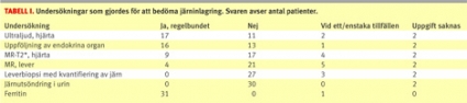 Undersökningen som utfördes i störst omfattning var ultraljudsundersökning av hjärtat, hälften av patienterna undersöktes årligen. Den nya magnetresonans(MR)metoden med T2*-teknik för undersökning av järninlagring i hjärtat finns att tillgå på några större sjukhus. 30 procent (9/30) undersöktes regelbundet. Endast 13 procent (4/30) genomgick MR-undersökning av lever. Leverbiopsi med kvantifiering av järn förekom endast vid enstaka tillfällen för ett fåtal patienter. Järnutsöndring i urin undersöktes inte någonstans. Bentäthetsmätning eller annan skelettundersökning utfördes på 10 procent (3/30) av patienterna. Endokrina organ följdes regelbundet upp i 53 procent (16/30) av fallen. För 23 procent (7/30) av patienterna gjodes inga regelbundna undersökningar av järninlagringen utöver ferritin. Deferoxaminbehandling innebär risk för ögon- och hörselbiverkningar [2, 6], men endast 67 procent (18/27) följdes upp av ögon- och öron-, näs- och halsläkare avseende biverkningsrisken.