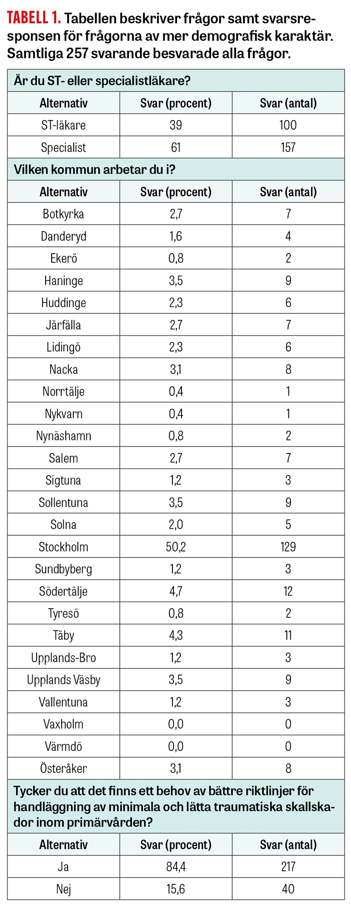 Enkäten skickades till totalt 286 ST-läkare och 548 specialister inom allmänmedicin, med en svarsfrekvens på 31 procent (n = 257). Av dessa var 100 (38,9 procent) ST-läkare och 157 (60,1 procent) specialister. En större andel av studiedeltagarna var från Stockholms kommun (> 50 procent), medan resterande var representativt fördelade bland övriga kommuner i Stockholms län. Övriga bakgrundsvariabler framgår av Tabell 1.