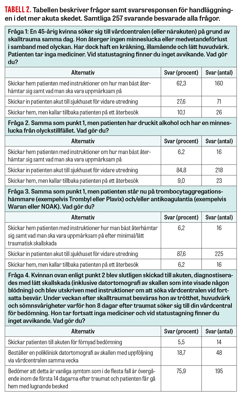 Den hypotetiska patienten är en 45-årig kvinna drabbad av mTBI samma dag som hon söker sig till primärvården. I den första frågan har patienten besvärats av huvudvärk, illamående och kräkningar men ingen medvetandeförlust. Majoriteten (72,4 procent) svarade att patienten kunde tas om hand polikliniskt. I den andra frågan modifieras fallet något och minnesförlust tillkommer. Här tyckte majoriteten (84,8 procent) att patienten borde remitteras akut till sjukhus. I den tredje frågan stod patienten på antikoagulation/antitrombotisk behandling och då tyckte hela 87,6 procent att patienten skulle skickas till sjukhus akut. Övriga variabler och svarsfördelning framgår av Tabell 2.