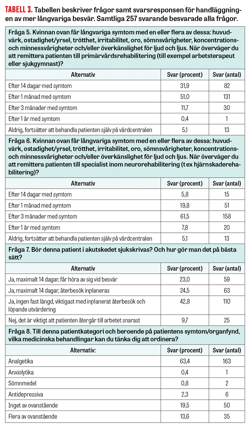 Vad gäller långvariga besvär tyckte 75,9 procent av de svarande att symtom som huvudvärk, ostadighet/yrsel, trötthet, irritabilitet, oro, sömnsvårigheter, koncentrations- och minnessvårigheter och/eller överkänslighet för ljud och ljus en vecka efter mTBI är vanliga och oftast övergående. Om symtomen kvarstår längre än en månad tyckte en knapp majoritet (51 procent) att det är dags att hänvisa patienten till en arbetsterapeut och/eller sjukgymnast. Om besvären kvarstår efter tre månader tyckte 61,5 procent att remiss till en specialist inom neurorehabilitering var det bästa alternativet (fråga 6). Majoriteten (90,3 procent) var eniga om att patienter utsatta för mTBI skulle sjukskrivas, men hur länge och under vilka premisser rådde det viss osäkerhet om (fråga 7). Slutligen ville majoriteten (63,4 procent, fråga 8) inte behandla patienter med sena besvär av mTBI med andra läkemedel än analgetika. Totalt 19,5 procent av de svarande ville varken behandla med analgetika, anxiolytika, sömnmedicin eller antidepressiva, medan 13,6 procent uppgav att man ville behandla med flera av svarsalternativen. På frågan om de svarande kände sig trygga med handläggningen av mTBI i primärvården var genomsnittet 6,5 (0 = otrygg; 10 = väldigt trygg). Övriga variabler och svarsfördelningen framgår av Tabell 3.