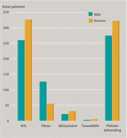 För närvarande saknas samlade, aktuella riktlinjer för oxygenbehandling i hemmet. Nationellt vårdprogram för kroniskt obstruktiv lungsjukdom (KOL) innehåller detaljerad information om oxygenbehandling, men det saknas information om andra diagnoser [1]. I Sverige påbörjar över 1500 patienter hembehandling med oxygen varje år, och numera har mer än hälften en annan grundsjukdom än KOL, enligt det nationella kvalitetsregistret Swedevox [2] (Figur 1). I 60 procent av fallen rör det sig om patienter med kronisk hypoxi orsakad av KOL, annan lungsjukdom eller hjärtsvikt. I 40 procent av fallen är behandlingen palliativ med syfte att lindra dyspné vid cancer. Medianåldern vid start av behandling med hemoxygen har successivt ökat i Sverige och är nu 75 år. Behandlingen ges i det egna hemmet, på sjukhem eller på palliativa avdelningar. Vårt syfte är att ge samlade riktlinjer för oxygenbehandling i hemmet utifrån aktuellt vetenskapligt underlag.