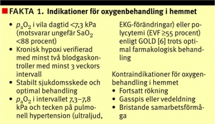 I dagens sjukvård med allt kortare vårdtider startas ofta hemoxygenbehandling i samband med en akut exacerbation av KOL. Inom tre månader skall behandlingen omprövas genom en blodgaskontroll på luftandning (minst 20 minuter). Om då paO2 förbättrats och överstiger 7,3 kPa föreligger inte längre indikation för fortsatt oxygenbehandling i hemmet [7].