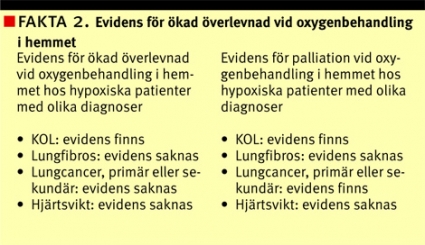 Vår rekommendation är alltså att använda oxygen så många timmar på dygnet som möjligt, helst 24! En förbättrad livskvalitet med oxygen är visad hos patienter med mobil utrustning [5]. Indikationer för oxygenbehandling i hemmet och evidens för överlevnad presenteras i Fakta 1 och Fakta 2.