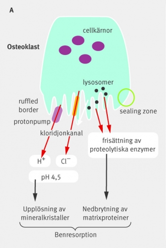 Hos en frisk vuxen individ omsätts 10 procent av skelettet varje år – mer i trabekulärt än i kompakt ben – vilket är förklaringen till att metabola bensjukdomar som postmenopausal osteoporos framför allt drabbar ben med relativt stor proportion trabekulärt ben som till exempel kotor och underarmsben [3]. Processen startar med att osteoklaster bryter ned det mineraliserade benet med mekanismer som initialt inbegriper upplösning av mineralkristallerna och som sedan följs av enzymatisk nedbrytning av proteinerna i benmatrixen (Figur 1A) [4]. Observera alltså att bennedbrytning alltid omfattar såväl urkalkning som matrixnedbrytning och att det inte finns något sätt att in vivo enbart urkalka skelettet. Demineraliseringen sker genom surgörning som möjliggörs genom att osteoklaster har både en protonpump och en kloridjonkanal i den del av cellen som kallas »ruffled border« och som bildas genom veckning av cellmembranet i resorptionslakunen. Matrixnedbrytningen är en följd av frisättning av proteolytiska enzymer in i resorptionslakunen. Dessa enzymer är ofullständigt kända även om vi vet att katepsin K har en betydelsefull roll. När den flerkärniga osteoklasten resorberar ben adhererar den till ben med en sugkoppsliknande mekanism som kallas »sealing zone« (adhesionzon). Molekylärt medieras adhesionen av en bindning mellan vitronektinreceptorer i osteoklastens cellmembran och osteopontin, som är ett av de många icke-kollagena proteinerna i benmatrixen. Hur en osteoklast vet vilken del av skelettet som behöver remodelleras är helt okänt, liksom också hur cellen vet när processen skall avslutas. Det är också okänt vilka molekylära förändringar som har skett i en benvävnad som behöver remodelleras, men det brukar förklaras med »materialtrötthet«.