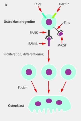 I benmärgen finns inte bara hematopoetiska celler utan också så kallade stromaceller, multipotenta celler som kan utvecklas till bland annat fettceller, broskceller eller osteoblaster. Om stromaceller aktiveras av benresorptionsstimulerande hormoner som paratyreoideahormon (PTH) och 1,25(OH)2-vitamin D3 (vitamin D3) uttrycker de molekyler som M-CSF och RANKL [4-6]. Via direktkontakt mellan stromaceller och de progenitorceller som kan utvecklas till osteoklaster, makrofager eller dendritiska celler aktiveras progenitorcellerna längs den osteoklastiska linjen med hjälp av M-CSF och RANKL. När osteoklastprogenitorceller slutgiltigt aktiveras till flerkärniga osteoklaster i periost eller endost är det osteoblaster på benytan, aktiverade med PTH eller vitamin D3, som etablerar direktkontakt med progenitorcellerna och sedan terminalt differentierar dessa till osteoklaster med hjälp av RANKL, M-CSF och aktivering av DAP12/FcRγ.