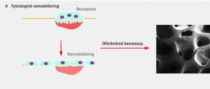 När osteoklasterna har avslutat resorptionen uppträder osteoblaster i resorptionslakunen [1]. Under normala fysiologiska betingelser bildas lika mycket nytt ben som osteoklasterna resorberat och vi behåller mängden benmassa oförändrad (Figur 2A). Hos en frisk individ har man beräknat att remodellering pågår på 1–2 miljoner enstaka ombyggnadsställen i de 220 ben som utgör skelettet. Nedbrytningsprocessen tar 3 till 4 veckor medan den efterföljande nybildningen tar 2 till 4 månader. Hur kopplingen mellan resorption och benbildning molekylärt regleras är inte känt, men frisättning av osteoblaststimulerande signalmolekyler som TGF-β och IGF från benmatrix spelar förmodligen en viktig roll.