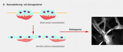 Postmenopausal osteoporos definieras som förlust av benmassa omfattande mer än 2,5 standarddeviationer jämfört med unga kvinnor i samma population. Tillsammans med en förändrad arkitektur av bentrabeklerna leder den minskade benmassan till ökad risk för fragilitetsfraktur [8, 9]. Risk för minskad benmassa är särskilt hög för kvinnor i samband med och efter menopaus. Efter 65-årsåldern är risken för minskad benmassa lika stor hos män och kvinnor och drabbar då både trabekulärt och kortikalt ben. Den snabbt insättande postmenopausala benförlusten beror på minskande östrogennivåer och kan också uppträda hos kvinnor som premenopausalt drabbas av minskande östrogennivåer. Den postmenopausala benförlusten beror på att antalet remodelleringsställen drastiskt har ökat och att osteoblaster inte förmår att fylla ut resorptionslakunerna helt och hållet (Figur 2). Dessa förändringar beror på minskade östrogennivåer vilket dels leder till ökad bildning av osteoklaster och dels till minskad stimulans av osteoblasternas benbildande förmåga. Av dessa anses den ökade resorptionen vara mest betydelsefull.