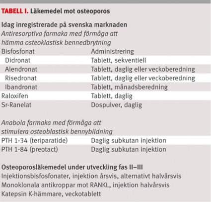sikte på att minska förlusten av benvävnad vid remodellering, samt att eventuellt kunna bygga upp nytt ben [12]. Flera av dessa läkemedel har även genomgått stora fas III-studier i vilka de klart visat sig ha förmåga att inte bara öka bentätheten utan även reducera risken för frakturer. Idag har vi fem olika typer av skelettspecifika läkemedel inregistrerade som alla visat sig minska frakturrisken (Tabell I).