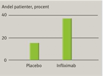 Bland de speciella egenskaper som gäller för infliximab är det snabba tillslaget och läkningen av tarmslemhinnan [11]. På grund av detta anses infliximab lämplig för behandling av terapiresistent Crohns sjukdom. I den grundläggande studien av Targan [6] fann man positivt behandlingssvar hos 65 procent av patienterna inom fyra veckor, mot 16 procent efter samma tid med placebo. En senare studie, ACCENT I, som genomfördes på patienter med terapiresistens mot aminosalicylater, steroider och immunsuppressiva visade att totalt 58 procent fick ett positivt behandlingssvar inom 14 dagar på dosering enligt planerat schema vecka 0, 2 och 6 följt av underhållsbehandling var åttonde vecka [9]. Infliximab uppvisade bättre behandlingseffekt än placebo (Figur 1).