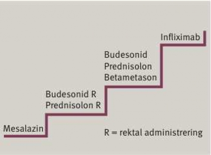 Infliximab har plats i behandlingen när sjukdomen är resistent eller refraktär mot optimerad konventionell behandling med steroider och immunsuppressiva (Figur 3). För ulcerös kolit finns dock dokumentation bara för behandling under 22 veckor med fortsatt uppföljning under ytterligare 52 veckor [20].