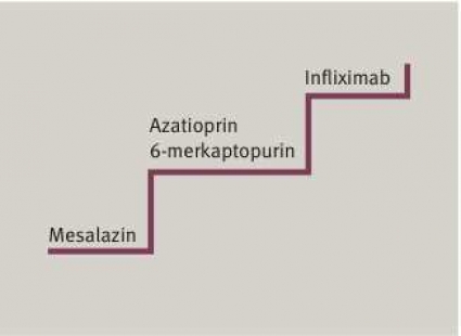 Infliximab måste således ses som ett tredjehandspreparat i behandlingen och skall ges med fortsatt samtidig steroidbehandling och immunsuppression. Parallellt med detta har man också diskuterat att introducera infliximab redan tidigt i behandlingen tillsammans med en immunmodulator (azatioprin). Tanken med denna strategi är att kunna minska exponeringen för höga steroiddoser. Det finns ännu ingen evidens för att denna strategi skulle förändra sjukdomsförloppet eller minska de oönskade steroideffekterna.
