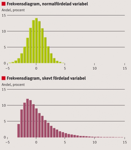 Om variabeln är normalfördelad, redovisas i typfallet medelvärdet med dess standardavvikelse. Om variabeln i stället är skevt fördelad eller om det finns extremvärden som påverkar medelvärdet, är medianvärdet tillsammans med interkvartilavståndet ofta att föredra. Centralmått och spridningsmått kan med fördel redovisas grafiskt, exempelvis med hjälp av frekvensdiagram (Figur 1).