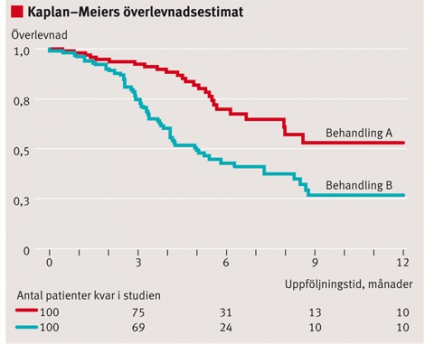 I överlevnadsstudier måste man därmed i praktiken beakta två utfall: dels huruvida patienten censurerats eller drabbats av utfallet, dels hur lång tid patienten följts. En vanlig metod för att studera patientöverlevnad är Kaplan–Meier-metoden. Den används för att konstruera överlevnadskurvor, där andelen exponerade respektive oexponerade patienter som fortfarande följs för utfallet beräknas vid varje given tidpunkt (Figur 4). Eftersom Kaplan–Meier-metoden i sin grundform inte tillåter justering för förväxling används ofta regressionsmodeller som tar hänsyn till både utfallet och tiden fram till utfallet. Exempel på sådana modeller är Cox- och Poissonregression [1].