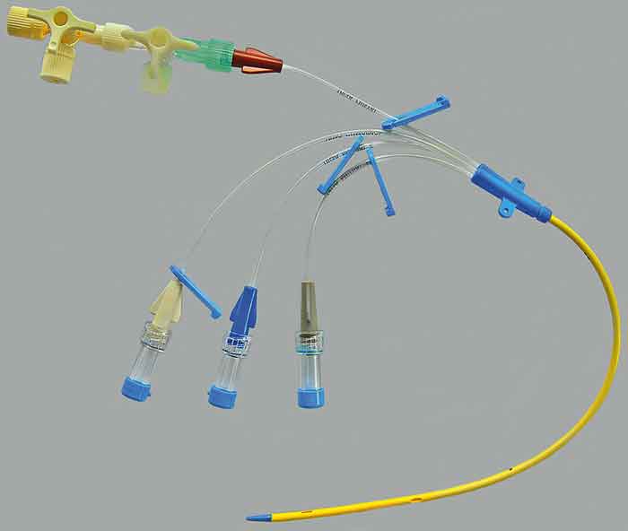 Figur 1. Central venkateter med fyra lumen. Varje lumen är separerat ända tills det når blodbanan. Till den översta infarten är två 3-vägskranar kopplade, vilket gör att upp till tre infusionsvätskor/läkemedel kan komma att blandas i den slangen innan de når blodbanan.