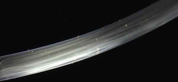 Figur 2. Reaktion mellan furosemid och vankomycin bildar en vit utfällning i en kateter (överst); samma kateter före utfällning som jämförelse (underst).