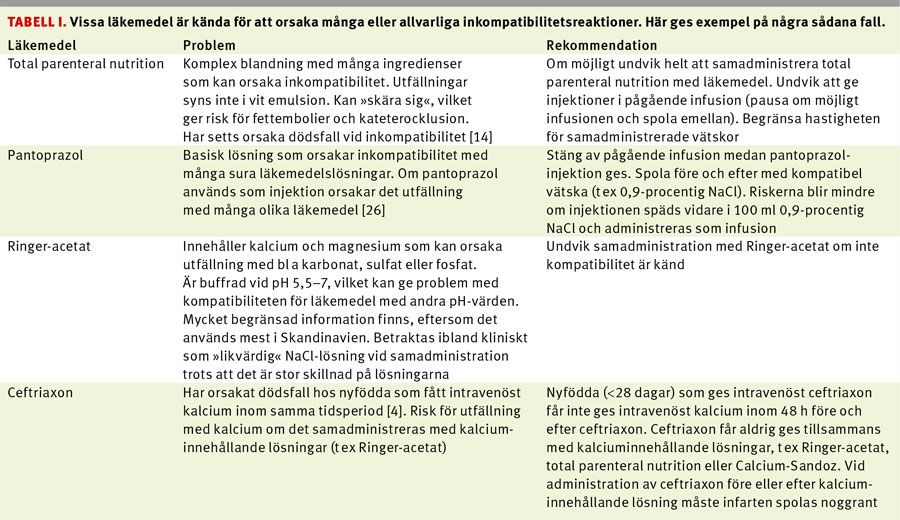Problem med osäkerheten kring kompatibilitet mellan läkemedel uppmärksammas sällan i rutiner, fackpress eller ordinationer. Vi vill härmed lyfta frågan om blandbarhet och belysa vad som kan göras för att minska riskerna vid samadministration. Vi ger också några exempel på läkemedel med extra stor risk att orsaka problem (Tabell I).