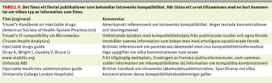 Gängse kompatibilitetsinformation i litteratur och databaser [19] är ofta baserad på fysikaliska kompatibilitetsstudier, där läkemedel blandas i lika delar och sedan observeras för utfällning under en definierad tid (vanligtvis 4 timmar) [20]. Exempel på användbara källor för kompatibilitetsdata ges i Tabell II. Informationen från sådana källor bör jämföras med den tänkta kliniska användningen med avseende på koncentration, lösningsmedel, beredningsform och eventuella hjälpämnen [21, 22]. Det är inte ovanligt att olika information om blandbarhet finns för samma kombination av läkemedel, beroende på variabilitet i ovan nämnda faktorer.