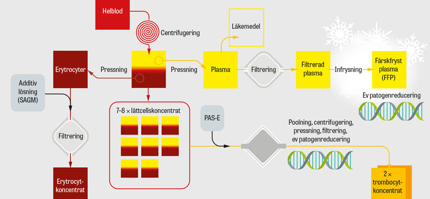Studier visar att prehospital behandling med blodprodukter medför en sänkt mortalitet [11, 13, 14]. I några regioner (Västra Götaland, Värmland, Jämtland–Härjedalen, Uppsala, Dalarna, och Västerbotten) har prehospitala blodprodukter införts på hittills sex ambulanshelikoptrar och på en läkarbil i Göteborg, men i större delen av landet är de ännu inte tillgängliga.