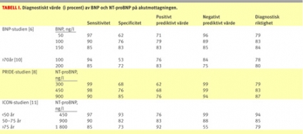 En liknande akutmottagningsstudie finns för NT-proBNP [8]. Den studien inluderade 599 patienter, av vilka 209 (35 procent) fick slutlig hjärtsviktsdiagnos. Resultaten var så gott som identiska med dem från BNP-studien. Ett NT-proBNP-gränsvärde på 300 ng/l resulterade i ett negativt prediktivt värde på 99 procent, dvs 99 procent av dem med NT-proBNP 300 ng/l visade sig inte ha hjärtsvikt (Tabell I). Det positiva prediktiva värdet var dock endast 62 procent vid detta gränsvärde, dvs 6 av 10 med NT-proBNP värde 300 ng/l eller högre hade hjärtsvikt. Därför föreslog författarna högre gränsvärden för att diagnostisera hjärtsvikt. Ett NT-proBNP-värde ≥450 ng/l hos personer 50 år och ≥900 ng/l hos personer ≥50 år gav positiva prediktiva värden på 67 respektive 77 procent. Precis som i BNP-studien var NT-proBNP-mätning bättre än akutläkare på att diagnostisera hjärtsvikt. Kombinationen klinisk bedömning och NT-proBNP var dock allra bäst.
