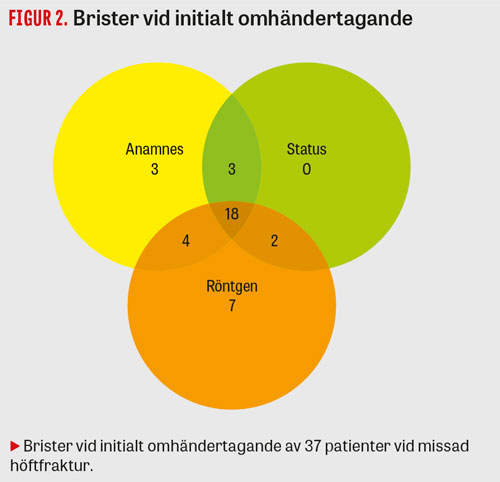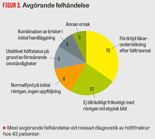 Orsaker till missad höftfraktur. 37 av 43 höftfrakturer förbisågs genom misstag av hälso- och sjukvårdspersonal. Av dessa 37 fall var 35 felaktigt handlagda i så måtto att IVO bedömt att patienten inte handlagts i enlighet med vetenskap och beprövad erfarenhet. Hos de resterande 2 patienterna bedömdes den missade höftfrakturen vara orsakad uteslutande av försvårande omständigheter, vilket innebär att diagnos missades trots att patienten handlagts i enlighet med accepterade rutiner (Figur 1).