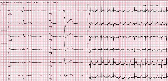 EKG visade under det första dygnet inget avvikande, men ett EKG 1,5 dygn efter inskrivning visade en bild förenlig med perimyokardit (Figur 1). Lungröntgen visade parenkymförändringar förenliga med covid-19, men inga tecken på kardiell inkompensation. DT-undersökning av lungartärer övervägdes, men låg risk enligt Wells-skalan och lågt D-dimervärde (0,13 mg/l FEU [fibrinogen equivalent units]), i kombination med att patienten saknade kliniska tecken och hereditet för djup ventrombos, gjorde att man avstod.