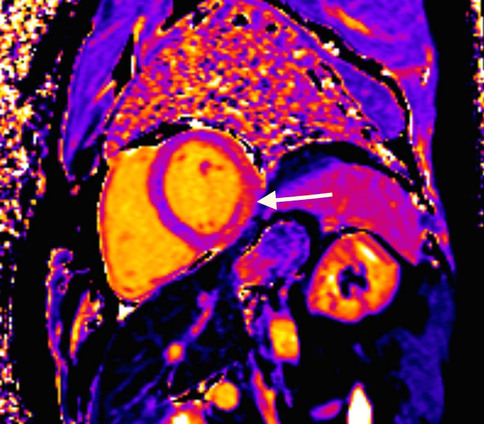 Figur 2. 1,5 tesla MR-undersökning av hjärta. T1-mappning visar normala T1-värden i septum, men förhöjda värden (> 1 200 ms) epikardiellt i vänster kammarvägg (markerat med vit pil), vilket indikerar ödematös vänsterkammare förenlig med myokardit.