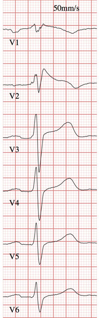 Figur 2. Fallbeskrivning 1. EKG, 50 mm/s. I avledning V2 noteras utseende som vid högergrenblock samt 6 mm ST-höjning och avslutande negativ T-våg.