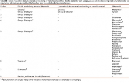 Av de 8 patienter som använde naturläkemedel regelbundet i samband med inskrivningen använde 6 samtidigt receptbelagda läkemedel. För flera av de kombinationer av naturläkemedel och läkemedel som patienterna använde kan risk för interaktion inte uteslutas. Till exempel har det visats att echinacea hämmar enzymer som är inblandade i metabolismen av olanzapin och sertralin [12], ginseng påverkar blodsockernivåer, vilket skulle kunna ha betydelse för effekten av metformin [8], omega3-fettsyror hämmar enzymer som metaboliserar mirtazapin och atorvastatin [12], och valeriana hämmar enzymer som metaboliserar zopiklon [12].