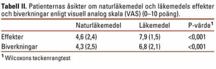Patienternas attityder kring naturläkemedel och läkemedels effekter och biverkningar redovisas i Tabell II. Naturläkemedel bedömdes som mindre effektiva än läkemedel. Behandling med naturläkemedel bedömdes också vara förenad med mindre risker än behandling med läkemedel. Åsikterna angående effekter och biverkningar av naturläkemedel och läkemedel skilde sig inte mellan patienter som använt naturläkemedel och patienter som aldrig använt naturläkemedel. Inte heller skilde sig åsikterna åt mellan män och kvinnor.