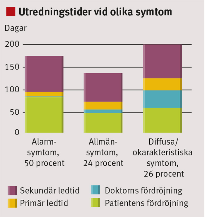 De bild- och funktionsdiagnostiska undersökningar som allmänläkarna på basis av patienternas symtom rekvirerade tog längre tid att genomföra för gruppen med alarmsymtom än för patienter med diffusa symtom. Således fick patienter med alarmsymtom ytterligare förlängd utredningstid, med såväl patientens fördröjning som doktorns (Figur 1).