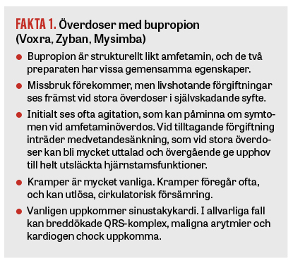 I Fakta 1 presenteras typiska symtom som kan uppkomma efter överdoser med bupropion.