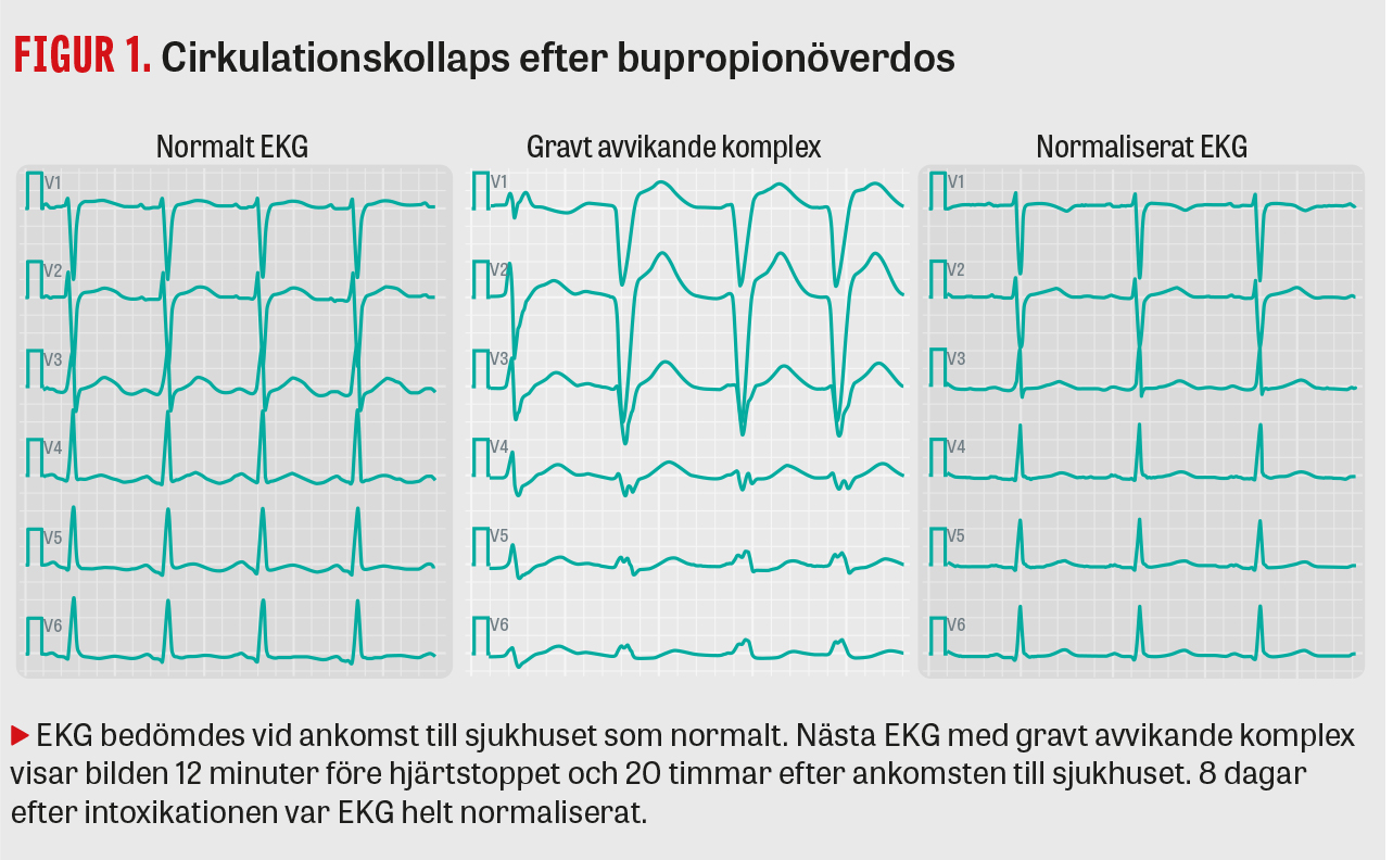 Hjärtpåverkan orsakas troligen, åtminstone delvis, genom en blockad av »gap junctions« mellan kardiomyocyterna [7]. Denna effekt skiljer sig från den mer välkända QRS-breddökning som ses vid förgiftning med till exempel amitriptylin (ett tricykliskt antidepressivum), som beror på en blockad av snabba natriumkanaler på kardiomyocytens yta. Vid amitriptylinförgiftning finns ett förutsägbart samband mellan graden av förgiftning och QRS-bredd. Detta gäller inte vid bupropionförgiftning. Vid överdoser av bupropion finns heller inte någon specifik behandling [8]. I det aktuella fallet gavs magnesium och lidokain, som ingår i standardarsenalen vid toxiska arytmier, men ingen av dessa behandlingar påverkade förloppet. Även elkonvertering prövades utan gynnsam effekt (obs! elkonvertering bör användas mycket restriktivt vid intoxikationer, eftersom åtgärden riskerar att utlösa en jämförelsevis mer malign arytmi) [9]. Fallet illustrerar därmed att en svår bupropionförgiftning kan vara omöjlig att hantera utan tillgång till ECMO-behandling.