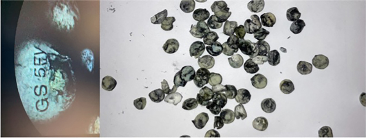 Under pågående ECMO-behandling 34 timmar efter ankomsten till sjukhus, utfördes en gastroskopi där 236 tabletter kunde evakueras. Samtliga tabletter identifierades visuellt som Voxra (bupropion) 150 mg (Figur 2). Tablettresterna analyserades så småningom med kärnmagnetisk resonansspektroskopi vid Läkemedelsverkets laboratorium och visade sig bara innehålla spårmängder av bupropion. Det evakuerade materialet bestod alltså av depåtabletternas höljen (»ghost tablets«) [5]. Vid tidpunkten för gastroskopin togs även blodprov för screening på rättskemiska laboratoriet i Linköping. Analysen (gaskromatografisk metod) påvisade mycket höga nivåer av bupropion och dess aktiva metabolit hydroxibupropion (790 respektive 3 100 µg/l) samt måttliga nivåer av olanzapin och alprazolam.
