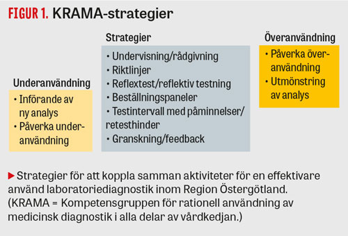 Som en följd av denna utveckling har laboratorieverksamheten inom Region Östergötland initierat strategier med syfte att åstadkomma en mer rationell användning av laboratoriemedicinska analyser. Detta har skett genom en aktivare uppföljning av beställningsmönster åtföljd av information och feedback i relation till observerade beställningsmönster. År 2016 initierades s k KRAMA-strategier (KRAMA = Kompetensgruppen för rationell användning av medicinsk diagnostik i alla delar av vårdkedjan) (Figur 1). En viktig ambition var att överge ett passivt testinförande till förmån för ett mer effektivt införande i kombination med aktiv uppföljning av beställningsmönster.
