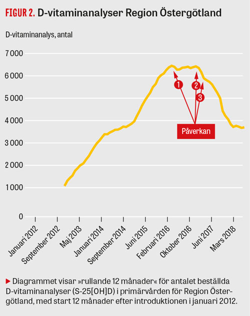 Feedback på D-vitaminanvändningen i form av utbildningsmöten på ca 45–60 minuter gavs av laboratorieläkare under 2016 vid respektive vårdcentral (påverkan 1, Figur 2). Information till medarbetare vid vårdcentralslaboratorierna skedde också (påverkan 2, Figur 2).