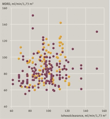 Klinisk kemi i Värmland har särskilda klockor som följer med patienten under iohexolbelastningen så att alla tidpunkter anges med samma klocka. Det är sannolikt en viktig faktor för att minimera felaktiga tidsangivelser. Iohexolbelastningar från Karlstad visar också en mycket god överensstämmelse med cystatin C-beräknat GFR (R2=0,956) [8]. Man kan också se att korrelationen mellan iohexolmätning utförd i Karlstad och P-kreatininmätning är något bättre än för de friska njurdonatorerna, men fortfarande är det en mycket dålig korrelation mellan iohexolclearance och P-kreatinin.