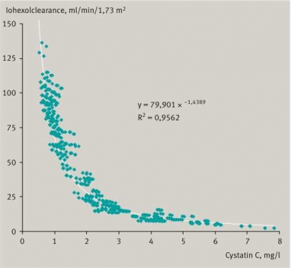 Praktiskt kan vi alltså konstatera att både våra screeninganalyser och våra etablerade standardmetoder för GFR-mätningar håller osäker kvalitet. Vi måste därför fundera över alternativ till dessa metoder. Cystatin C är en relativt ny GFR-markör som i metastudier visat sig vara överlägsen kreatinin som GFR-markör [9]. Det finns också en god koppling mellan iohexolclearance (utfört på Klinisk kemi, Karlstad) och cystatin C-beräknat GFR (R2=0,956) (Figur 3). Korrelationen mellan iohexolclearance och kreatinin i samma patientgrupp var lägre (R2=0,783). Ett potentiellt problem med cystatin C är att det förefaller som att de laboratorier som använder reagens från en av reagensleverantörerna visar en stor interlaboratorievariation. Det tycks dock finns goda möjligheter att minska denna interlaboratoriespridning för cystatin C.