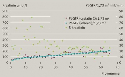Dagens svenska laboratorier har samkalibrerat sig med enzymatiska metoder för att få ett mer korrekt värde. Detta medför att de svenska laboratorierna skiljer sig nivåmässigt från de värden som är avpassade för Cockcroft–Gaults ekvation. Vi har nyligen rapporterat att det inte föreligger något signifikant samband mellan GFR beräknat med Cockcroft–Gaults ekvation eller MDRD-formlerna utifrån plasmakreatinin och iohexolclearance (R2=0,057) hos friska njurdonatorer [5]. Studien baserade sig på prov tagna på olika sjukhus runt om i Sverige på potentiella njurdonatorer. Studien ger därför ett mått på hur samstämmiga GFR-resultaten är på nationell nivå.