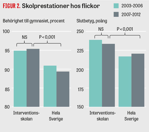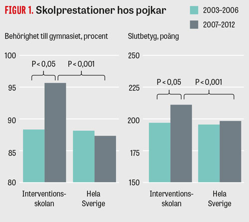 De pojkar som gick ut Ängslättskolan med daglig fysisk aktivitet hade bättre slutbetyg och högre andel gymnasiebehörighet än de pojkar som åren före interventionen gick ut Ängslättskolan med fysisk aktivitet 1–2 gånger per vecka (Figur 1). Andelen gymnasiebehöriga i gruppen med daglig fysisk aktivitet var drygt 7 procentenheter och genomsnittsbetyget över 13 poäng högre än i gruppen med fysisk aktivitet 1–2 gånger per vecka [18]. Om vi tittar på utvecklingen i Sverige under samma period sjönk skolprestationerna mellan dessa två perioder (Figur 1).
