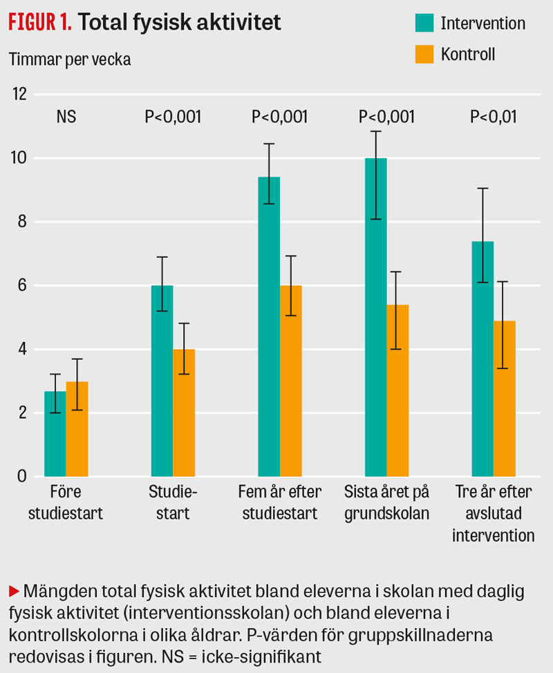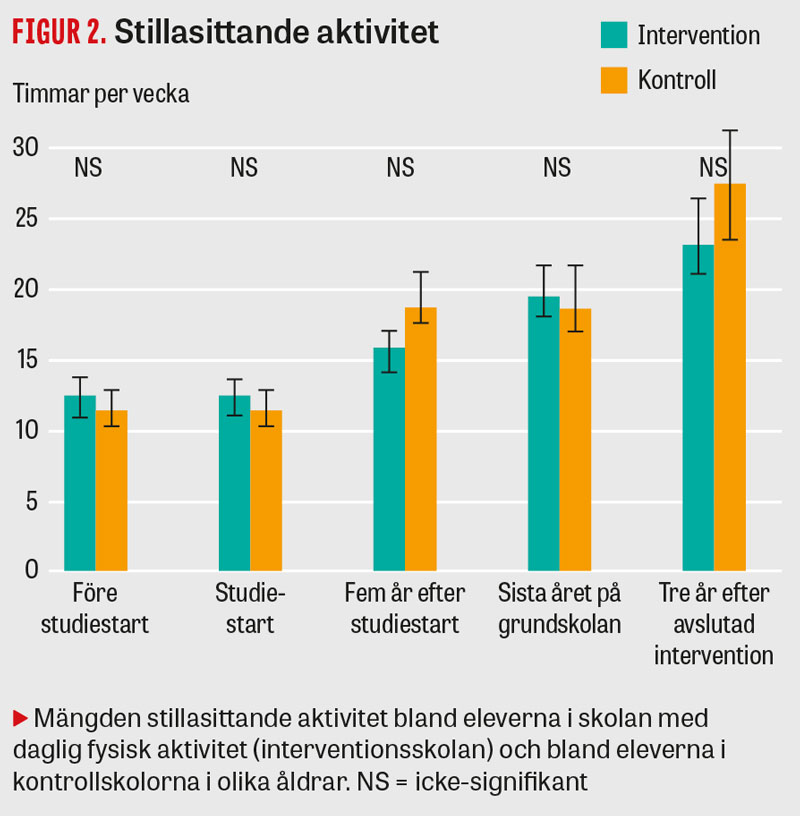 Efter 2 år med daglig skolidrott var barnen i interventionsskolan mer fysiskt aktiva än barnen i kontrollskolorna (Figur 1) [10]. Den högre fysiska aktivitetsnivån höll i sig under hela grundskoleperioden, utan att antal timmar skärmtid (stillasittande tid) påverkades (Figur 2) [11]. De individer som i grundskolan hade haft daglig fysisk aktivitet fortsatte att vara mer fysiskt aktiva även efter grundskoleperioden [8]. Fyra år efter interventionens slut var de i genomsnitt 3 timmar mer fysiskt aktiva per vecka än de individer som gått på kontrollskolorna (Figur 1). Dessutom spenderade de i snitt 4 timmar mindre per vecka med stillasittande aktiviteter än de som gått på kontrollskolorna (Figur 2) [8].