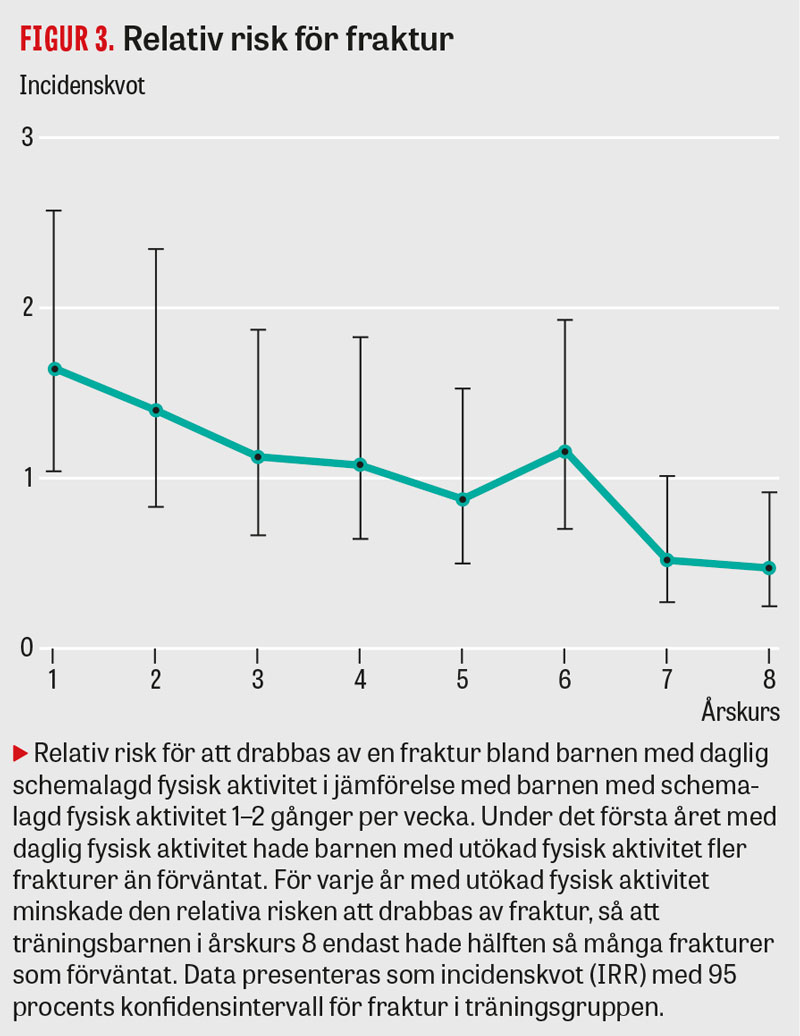 När vi hade visat att interventionen verkligen ökar den fysiska aktivitetsnivån blev nästa steg att värdera om den måttligt fysiska aktivitetsökningen ledde till mätbara effekter på skelett och muskelstyrka. Om man ska svara på denna fråga krävs en studie som startar före puberteten, eftersom förpubertet eller tidig pubertet är den period i livet då man har störst möjlighet att påverka benmassan [14]. Dessutom bör den fortgå till efter puberteten, då många ungdomars fysiska aktivitetsnivå minskar strax före och i puberteten, ofta mer hos flickor än hos pojkar [5]. Detta kan i så fall få långtgående konsekvenser eftersom upp mot 30 procent av individens benmassa inlagras under en tvåårsperiod av puberteten. Om man i stället kan bevara en hög benmassa till avslutad tillväxt borde även frakturförekomsten i vuxenlivet minska, eftersom hög benmassa betingad av fysisk aktivitet åtminstone delvis verkar kvarstå på lång sikt [15].